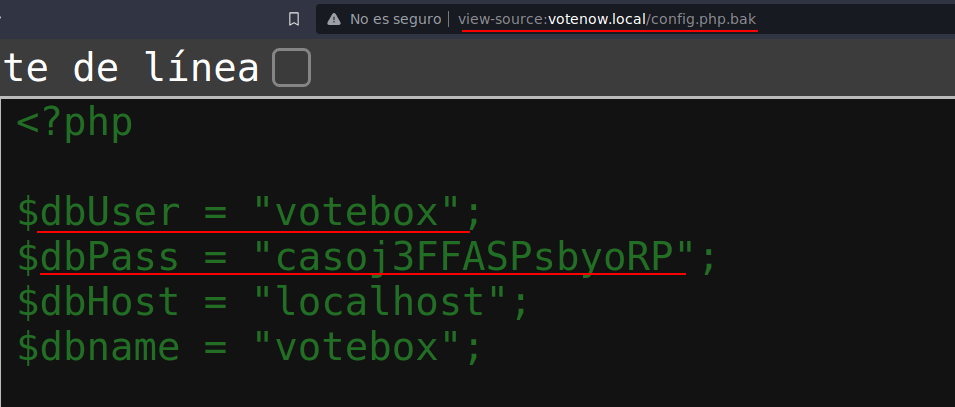 Tras esto nos damos cuenta que existe una página que es config.php. Si probamos a añadirle un .bak (http://10.0.2.22/config.php.bak) para ver si podemos referenciar un archivo de backup de este podemos ver lo siguiente en el código fuente: