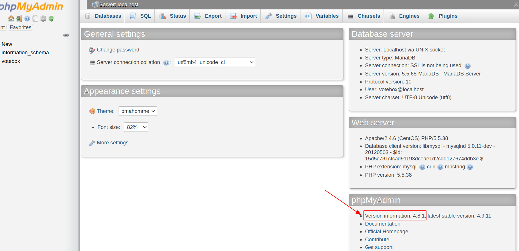Si accedemos a http://datasafe.votenow.local veremos un phpmyadmin en el cual podremos usar las credenciales que descubrimos anteriormente: