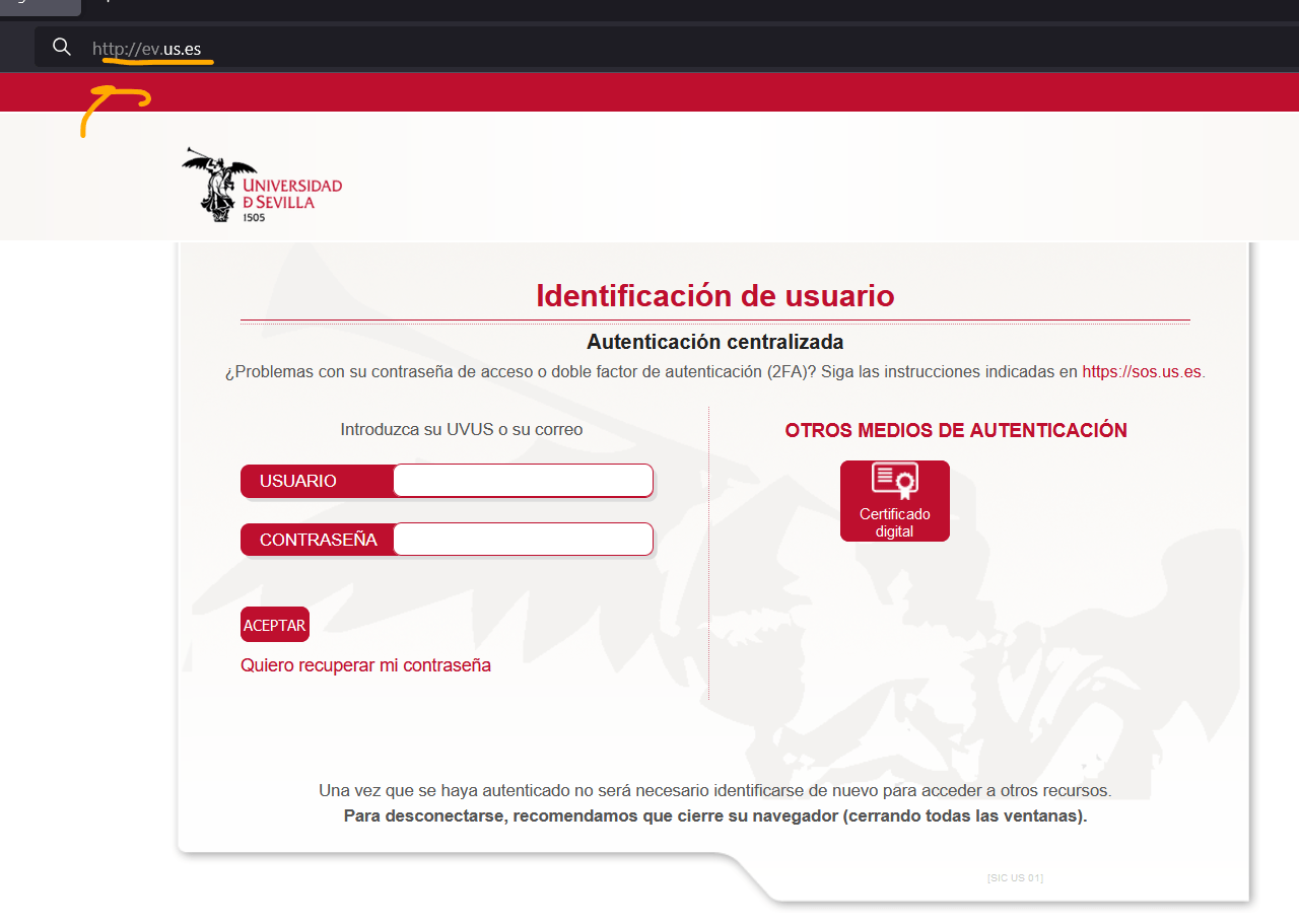 Si ahora accedemos con la máquina Windows a ev.us.es veremos lo siguiente: