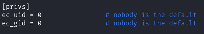 Lo primero que haremos será usar la herramienta ettercap. Esta herramienta nos ayudará con el ARP poisoning y el DNS spoofing al mismo tiempo. Antes de empezar, tendremos que realizar una breve configuración. Nos dirigiremos al archivo que se encuentra en /etc/ettercap/etter.conf y modificaremos los valores de ec_uid y ec_gid a 0.