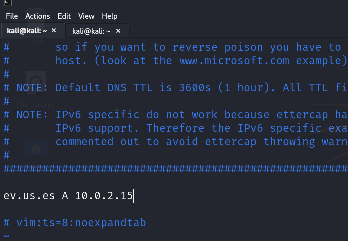 Una vez configurado el ettercap, configuraremos la DNS que queramos envenenar. Aquí pondremos la falsa traducción que queramos que la víctima sufra. En mi caso realizaré el phishing sobre una página de la Universidad de Sevilla.