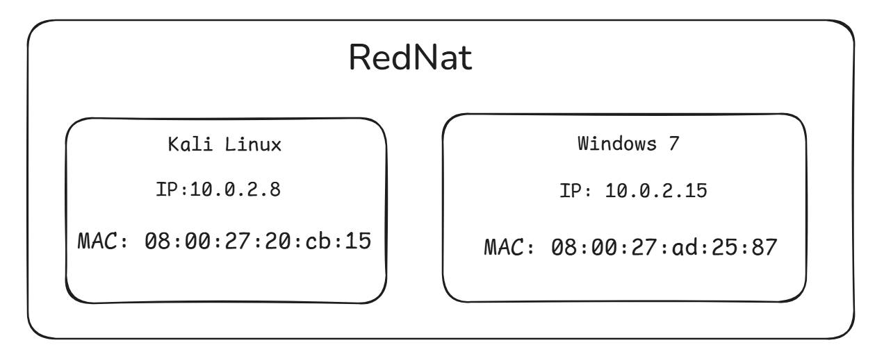 El laboratorio estará compuesto por una red de VirtualBox del tipo NAT llamada NatNetwork (un nombre muy original), en la cuál estarán dos máquinas: un Kali Linux que actuará de atacante y un Windows 7 que será la víctima.