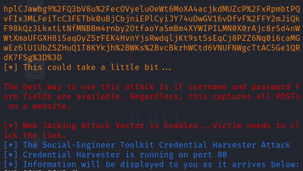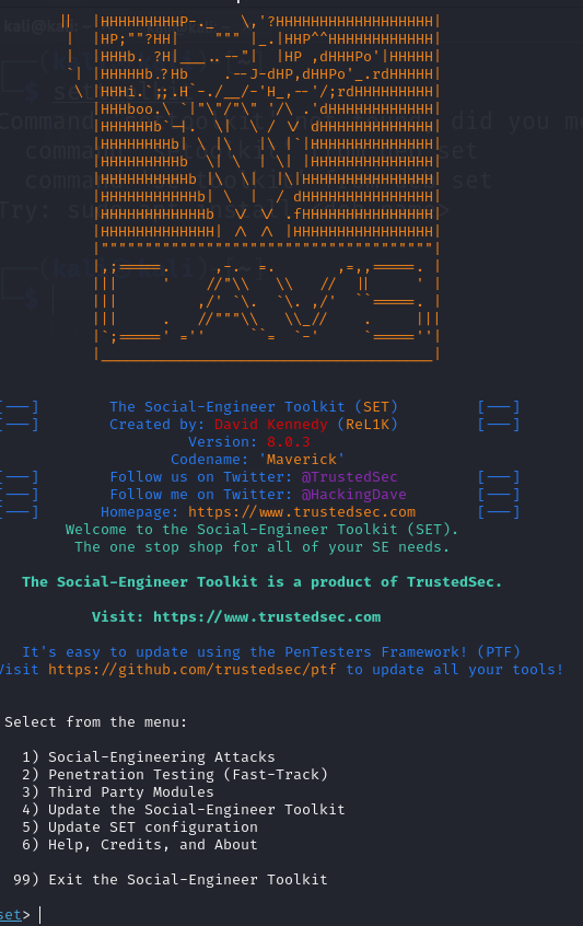 Ahora crearemos la página de phishing. Para ello usaré Social-Engineer Toolkit que viene preinstalado en Kali.